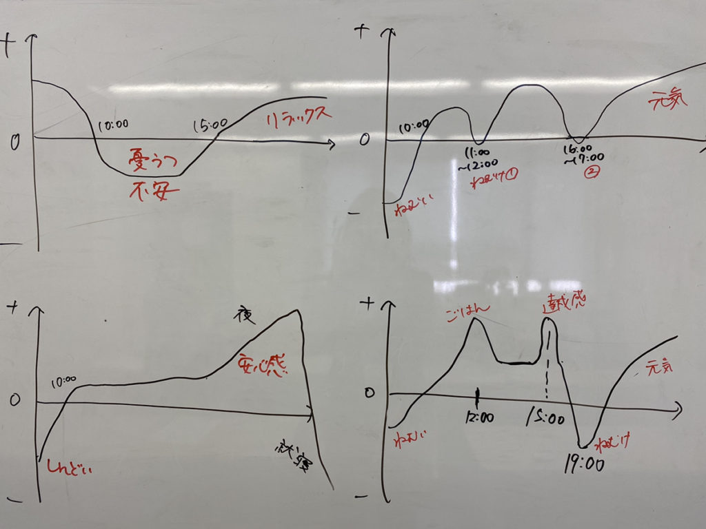 ということで、自分の気分の波をそれぞれグラフに書いてみました。