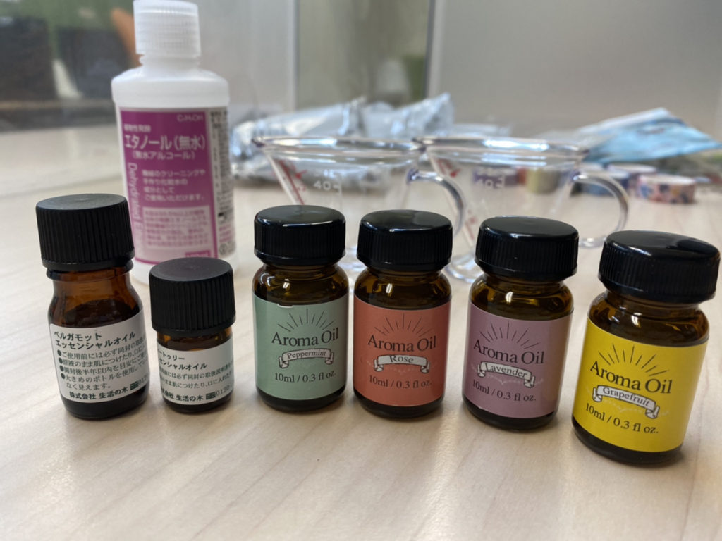 今回作ったのは、それぞれのお気に入りの香りのアロマを使った、 持ち運び用のアルコールスプレーです。
