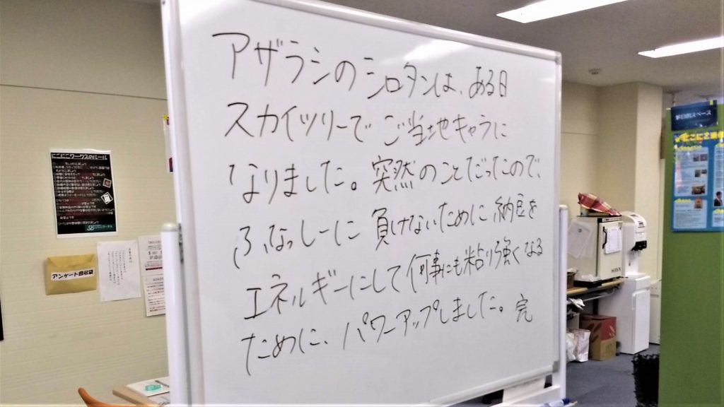 提示されたはじめの書き出しは、 「アザラシのシロタンは」 これに続く言葉をみんなでつないでいきます。 Aさん「ある日」 Bさん「スカイツリーで」 Cさん「ご当地キャラに」 ・・・という感じで、物語をみんなで作っていきます。