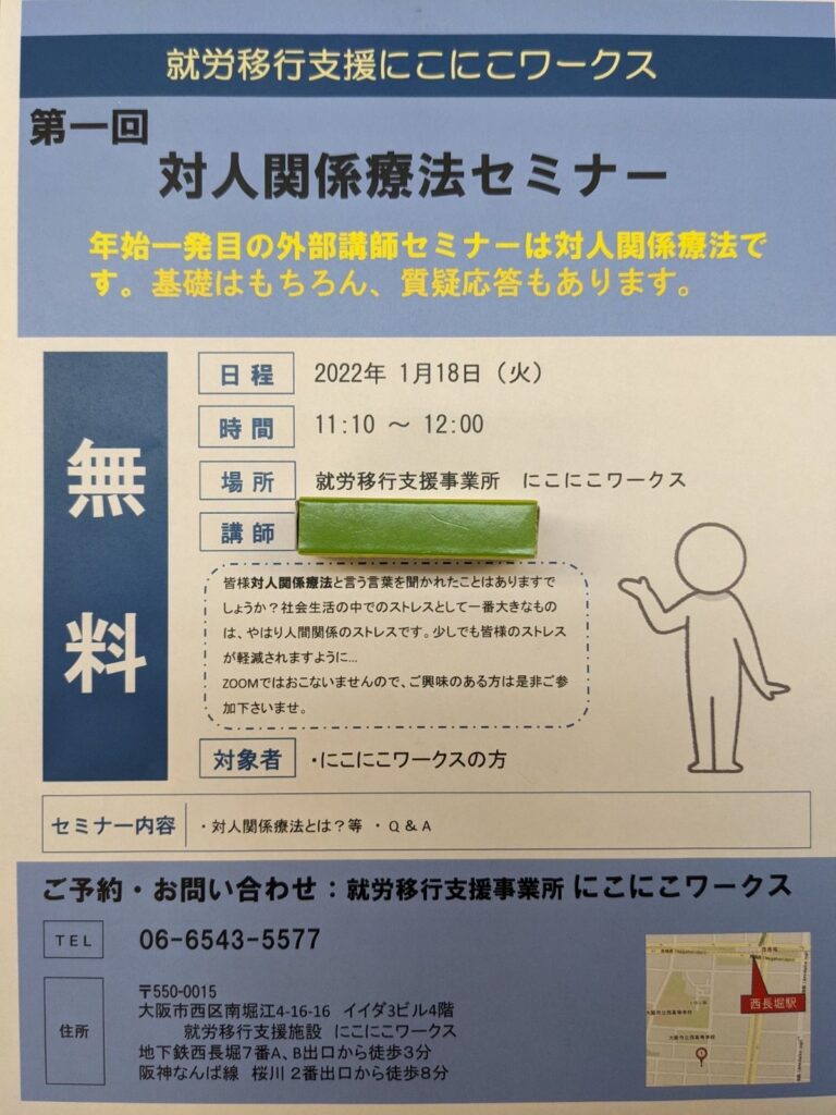 事業所名:就労移行支援事業所 にこにこワークス 所在地 :〒550-0015 大阪府大阪市西区南堀江4丁目16−16 イイダ3ビル 4F 電話番号:06-6543-5577 最寄り駅:地下鉄西長堀駅 7番出口から徒歩 2分(大阪市中央図書館付近です。) 阪神 桜川駅 2番出口から徒歩 8分(途中左手にマクドナルドが見えてきます。) ホームページ インスタグラム Facebook Twitter