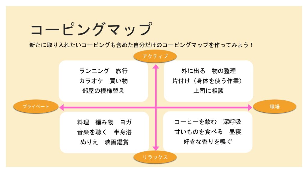それをもとにコーピングマップにしてみると、自分を助けてくれるツールになります。