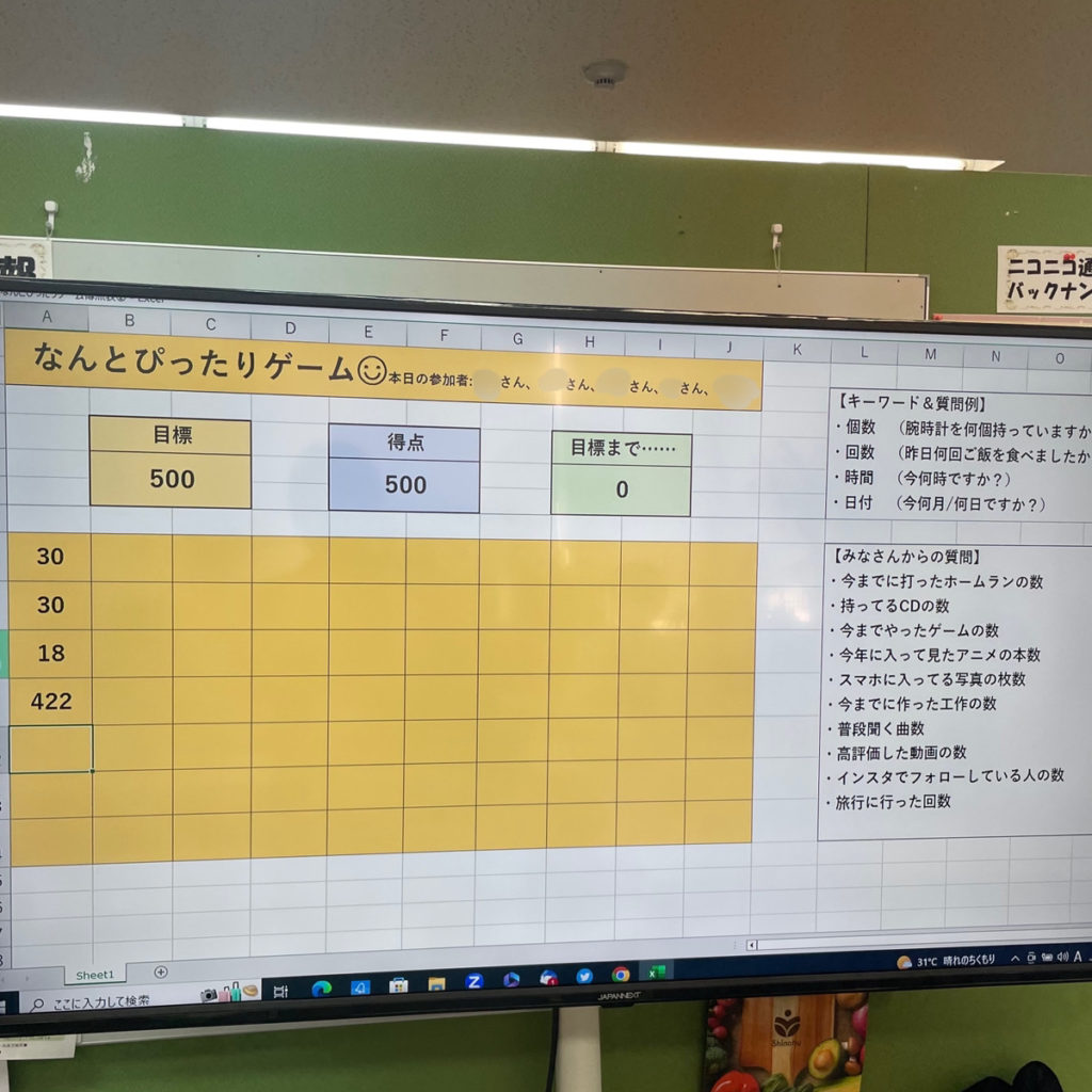 「なんとぴったりゲーム」では、みなさんで数字で答えられる質問をし合いながら、数を足していって、目標の数値に近づけていきます。 今回は、みなさんがお互いのことを知って質問しやすくなるように、まずは自己紹介から始めました☺
