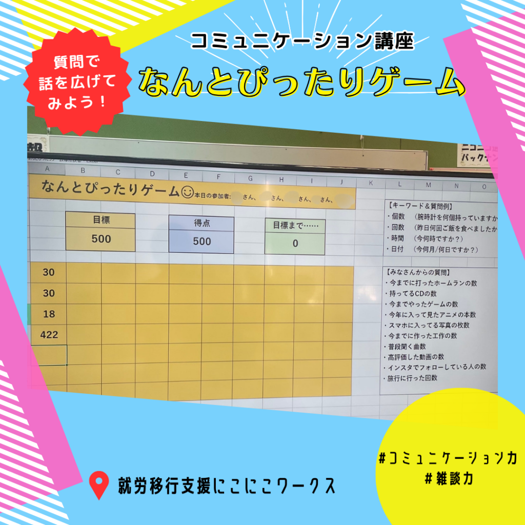 大阪市西区の就労移行支援事業所にこにこワークスで行っている精神疾患や発達障害の方へのサポート ~コミュニケーション講座「なんとぴったりゲーム」~