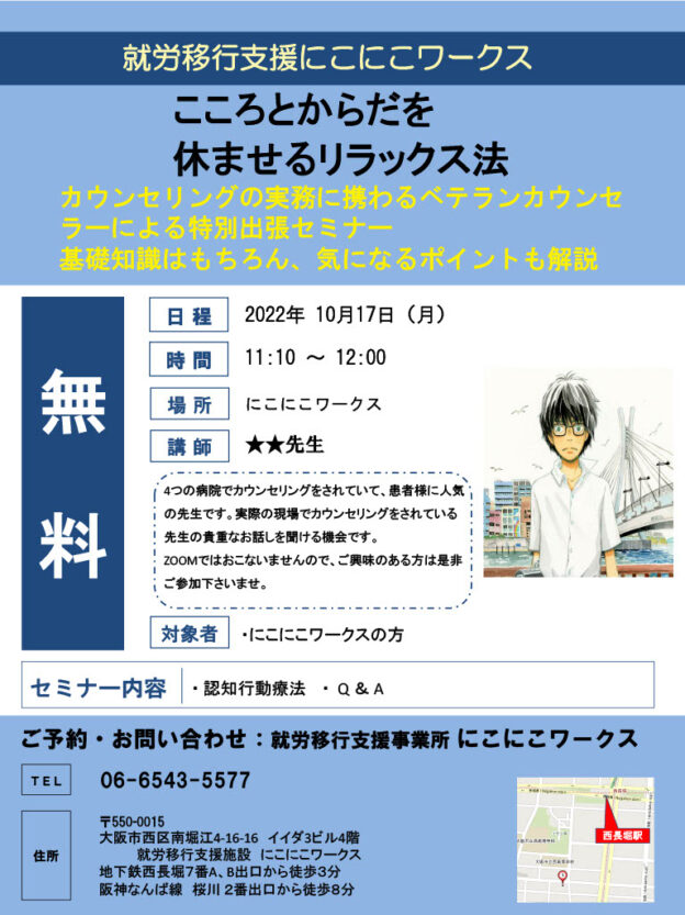 大阪市西区の就労移行支援事業所 にこにこワークスでは、 精神疾患や発達障害など、障がいや難病により単独で就職する事が困難で、 就職に支援が必要な方を対象に障害福祉サービスの提供を行っております。 ……