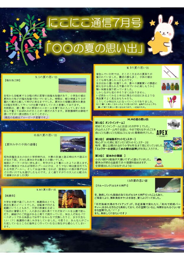 精神疾患や発達障害など、障がいや難病により単独で就職する事が困難で、就職に支援が必要な方を対象に障害福祉サービスの提供を行っております。 本日は七夕ですので、……