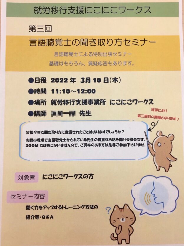 大阪市西区の就労移行支援事業所 にこにこワークスでは、発達障害や精神疾患(うつ病など)を抱え悩んでいる方が多く利用されてきました。 言語聴覚士(ST)の先生に……