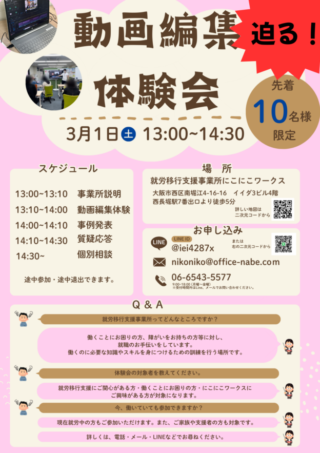 大阪市西区の就労移行支援事業所にこにこワークスでは、精神疾患や発達障害など、障がいや難病により単独で就職する事が困難で就職に支援が必要な方を対象に障害福祉サービスの提供を行っております。 ……