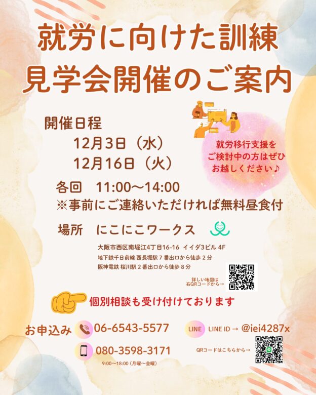 大阪市西区の就労移行支援事業所にこにこワークスでは、精神疾患や発達障害など、障がいや難病により単独で就職する事が困難で就職に支援が必要な方を対象に障害福祉サービスの提供を行っております。  ……